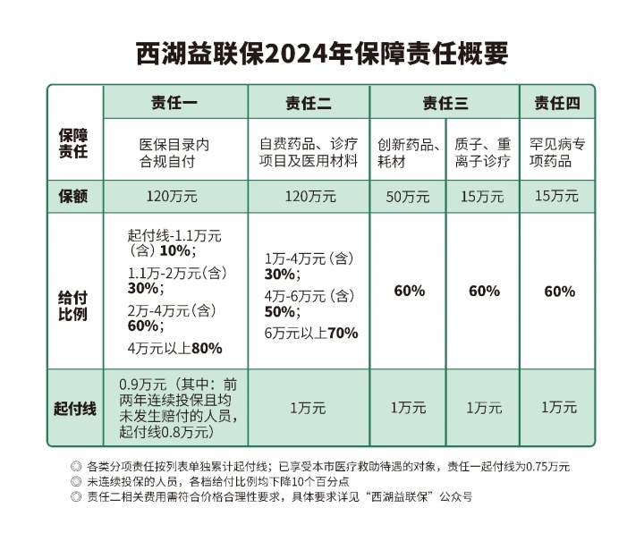 除了扩大保障人群,2024年度“西湖益联保”还在起付线、责任保额和缴费方式上进行了优化,在为投保市民减负的同时,进一步提升大病抵御能力。