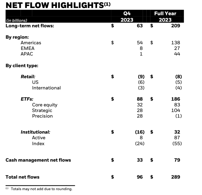 拆开来看:2023年全年,长期限类产品净流入(剔除现金管理)为2090亿美元,现金管理类产品净流入790亿美元。长期限产品内部,ETF全年吸引资金净流入1860亿美元。分区域来看,长期限产品中,美洲地区贡献了1380亿美元净流入,亚太地区贡献了440亿美元净流入。