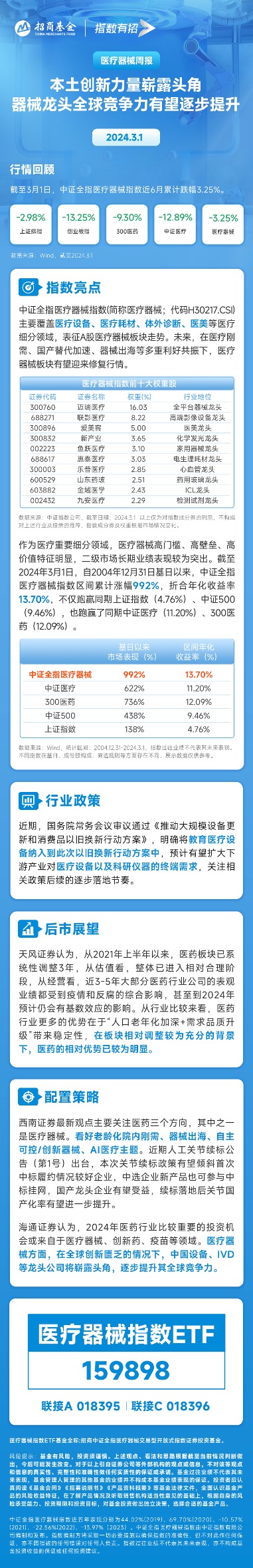 医疗器械指数ETF(159898)主要覆盖医疗设备、医疗耗材、体外诊断、医美等医疗细分领域,表征A股医疗器械板块走势。未来,在医疗刚需、国产替代加速、器械出海等多重利好共振下,医疗器械板块有望迎来修复行情。